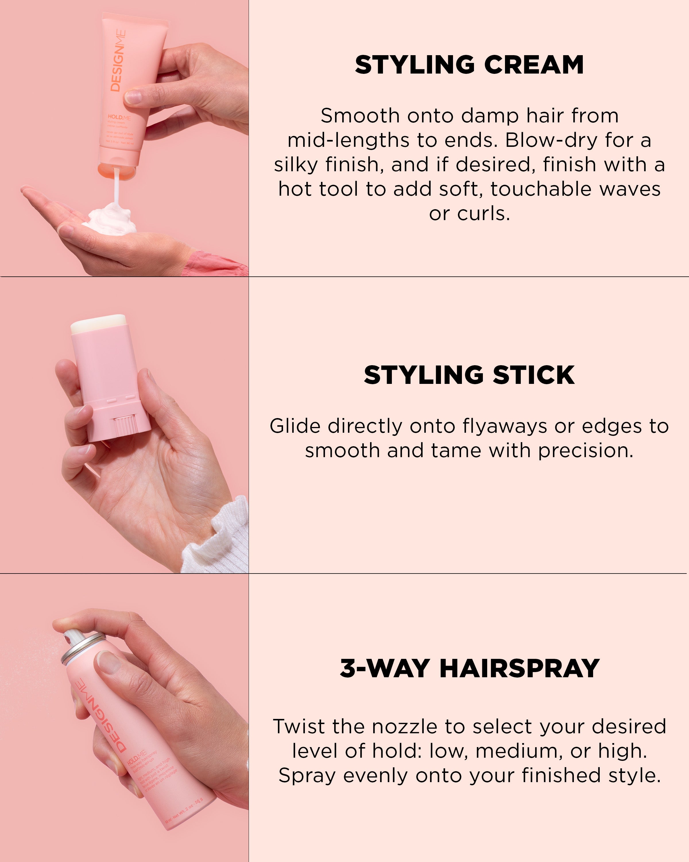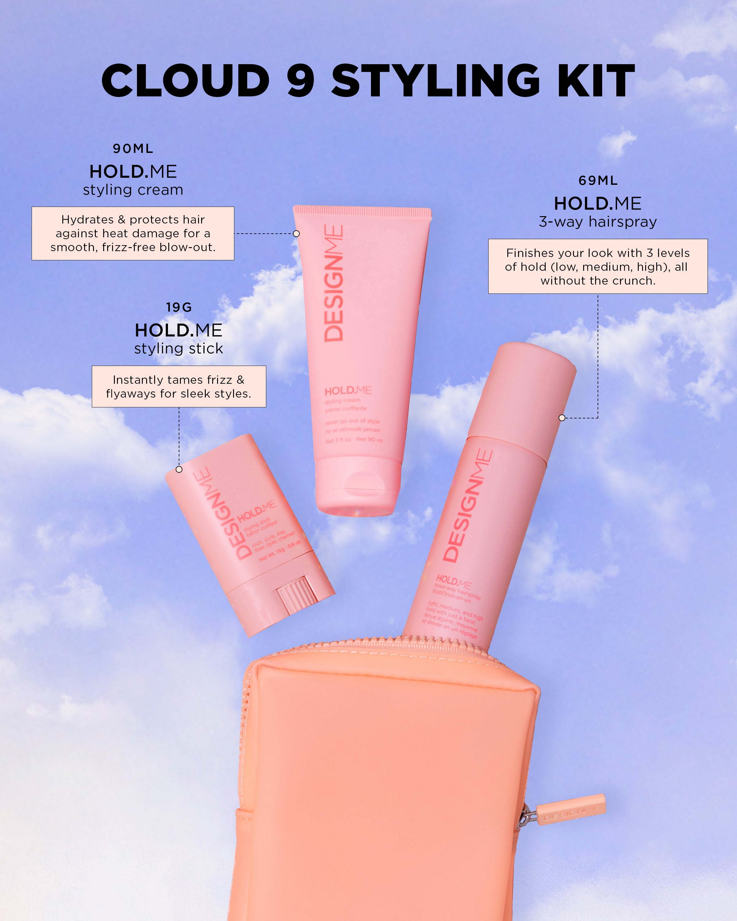 Turn heads at every celebration this season with the help of our limited-edition Cloud 9 Styling Kit! From sleek buns to soft waves, this kit gives you the versatility to style your strands for any occasion. Inside, you’ll find our full-size HOLD.ME styling stick for smooth, sleek-back looks, HOLD.ME styling cream for a salon-level blow-dry with lightweight shine, and HOLD.ME 3-way hairspray with adjustable hold (low, medium, high) to lock in your style just the way you like it. Together, it’s the perfect set to bring out your inner stylist and create soft, touchable and long-lasting styles. All products come in a cute, reusable, water-resistant pouch, ideal for gifting or treating yourself. Get ready to style, shine, and slay every look!